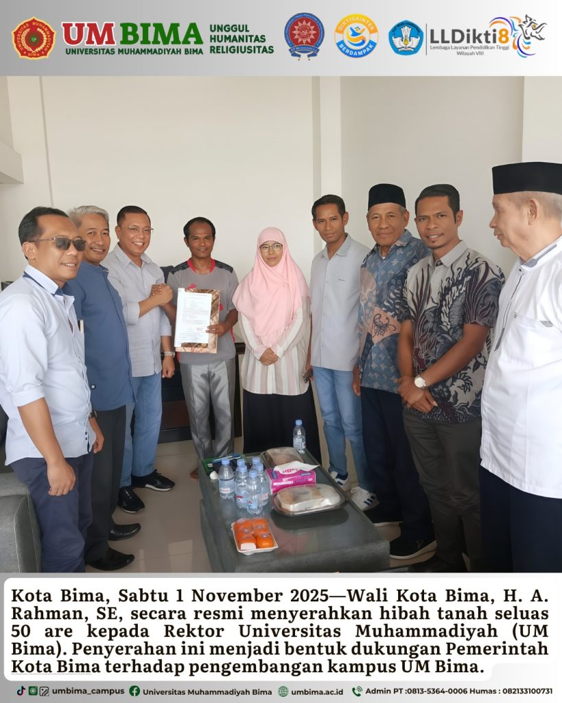 Pada hari Sabtu, 1 November 2025, Walikota Bima, H. A. Rahman, SE, secara resmi menyerahkan hibah tanah seluas 50 are kepada Rektor Universitas Muhammadiyah (UM Bima). Penyerahan ini dilakukan sebagai wujud komitmen dan dukungan penuh Pemerintah Kota Bima terhadap pengembangan institusi pendidikan tinggi tersebut.