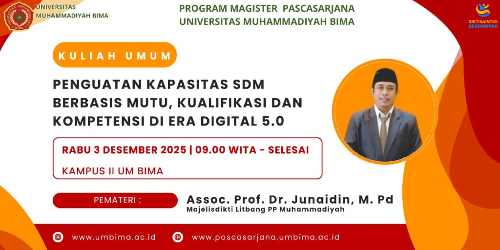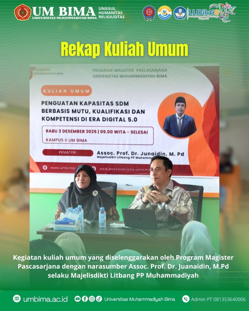 Program Magister Pascasarjana Universitas Muhammadiyah Bima kembali menyelenggarakan kegiatan Kuliah Umum dengan tema “Penguatan Kapasitas SDM Berbasis Mutu, Kualifikasi dan Kompetensi di Era Digital 5.0” pada Rabu, 3 Desember 2025, bertempat di Kampus II Universitas Muhammadiyah Bima.